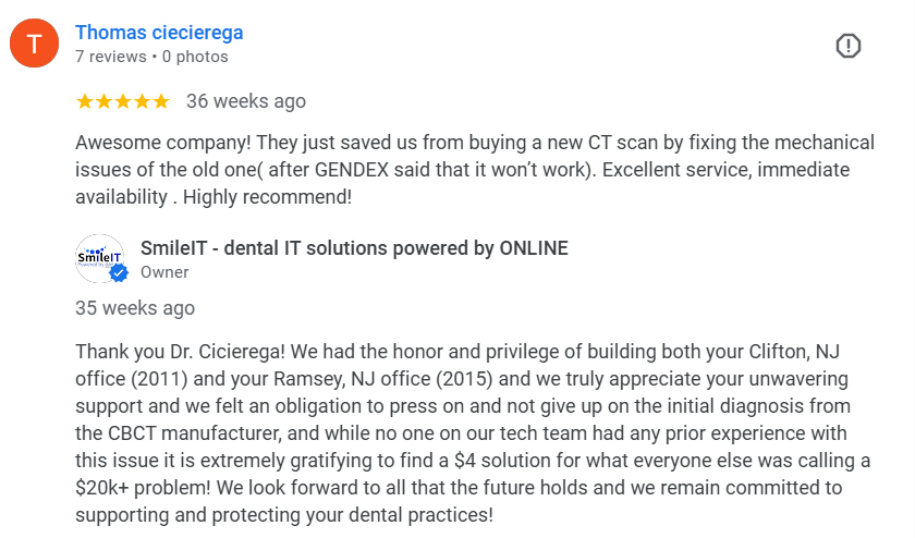 Our senior dental IT help desk team – all with dozens of years of experience installing and supporting advanced technologies in the digital dental office – quickly exhausted all possibilities of getting this device back online as the issue was identified as a malfunctioning component inside of the CBCT unit that would require a dental equipment technician to make the repair.