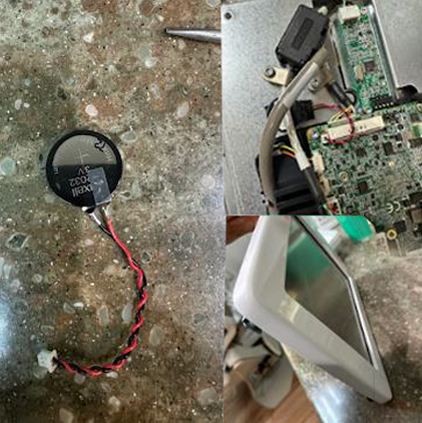 Inside of the CBCT units touch panel was a dead CMOS battery. When the battery failed, the basic configuration information was lost, preventing the CBCT unit from properly powering on and connecting to its acquisition system.